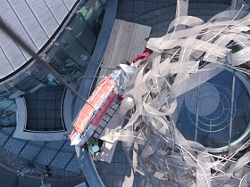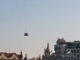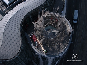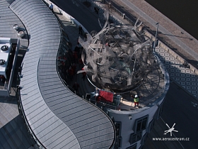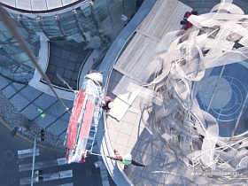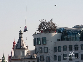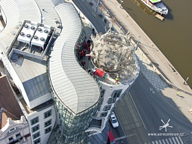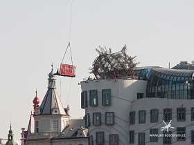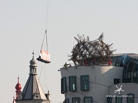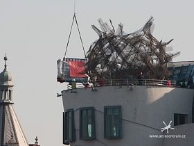 Tančící Dům- Rašínovo Nábřeží Vynesení nových skel na terasu budovy.